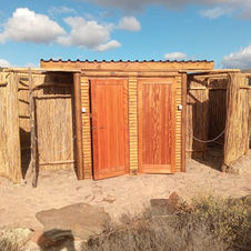 Rustic communal ablution with 2 flush loos, 2 outdoor hot water showers, double sink for washing dishes
